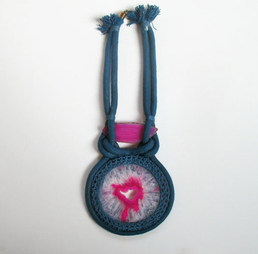 Indigo & Agate Necklace. Pink Stone. Hand Dyed Textile Jewelry.
