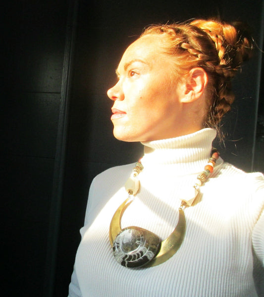 Goniatite Fossil Statement Necklace. Ancient Alien Tribal Bohemian Jewelry