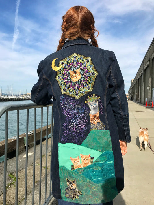 Custom Cosmic Cat Storybook Denim Coat. Made to Order