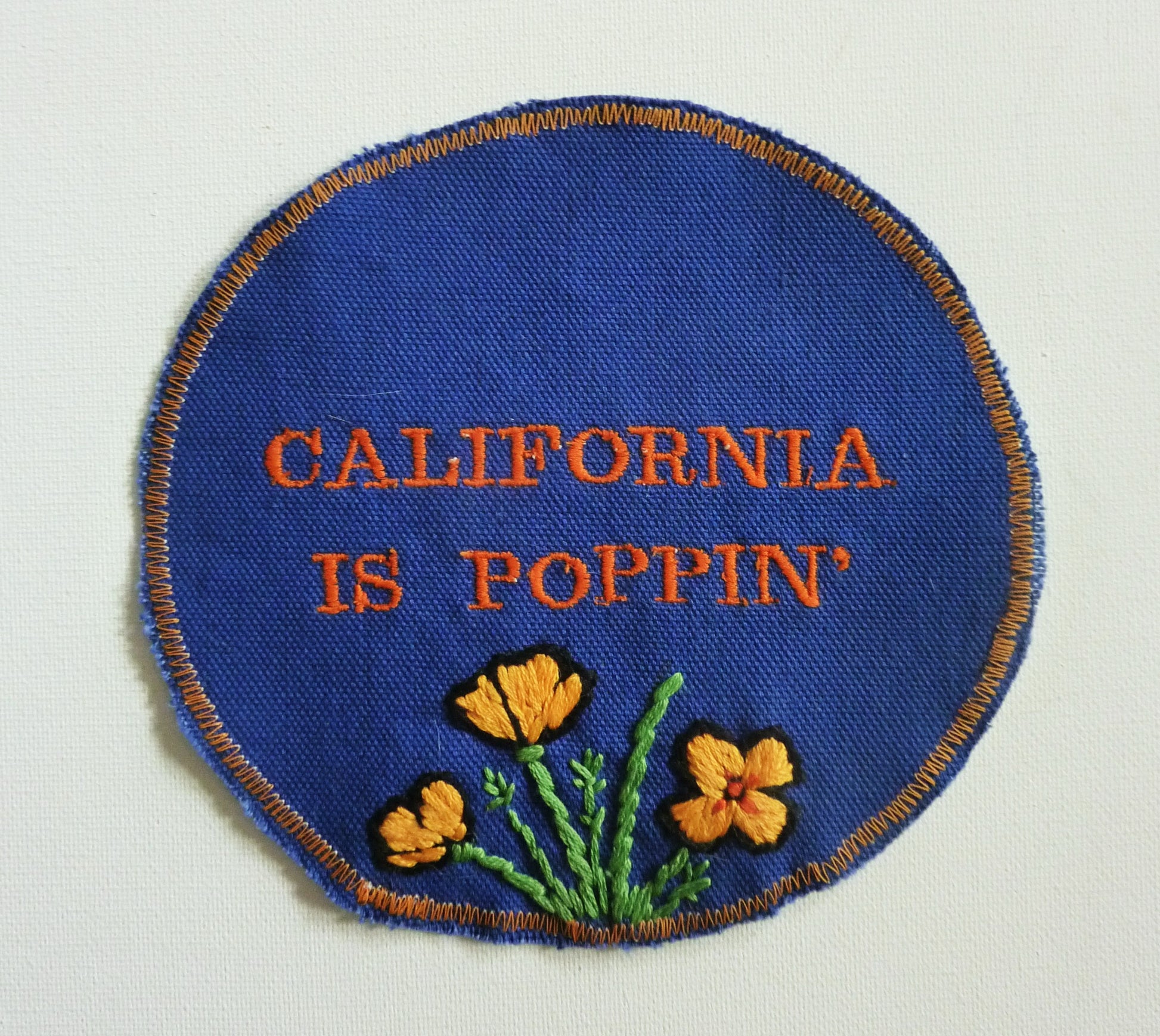 Poppies on a bright blue cotton canvas patch. Backed with fusible fabric for stability and durability.