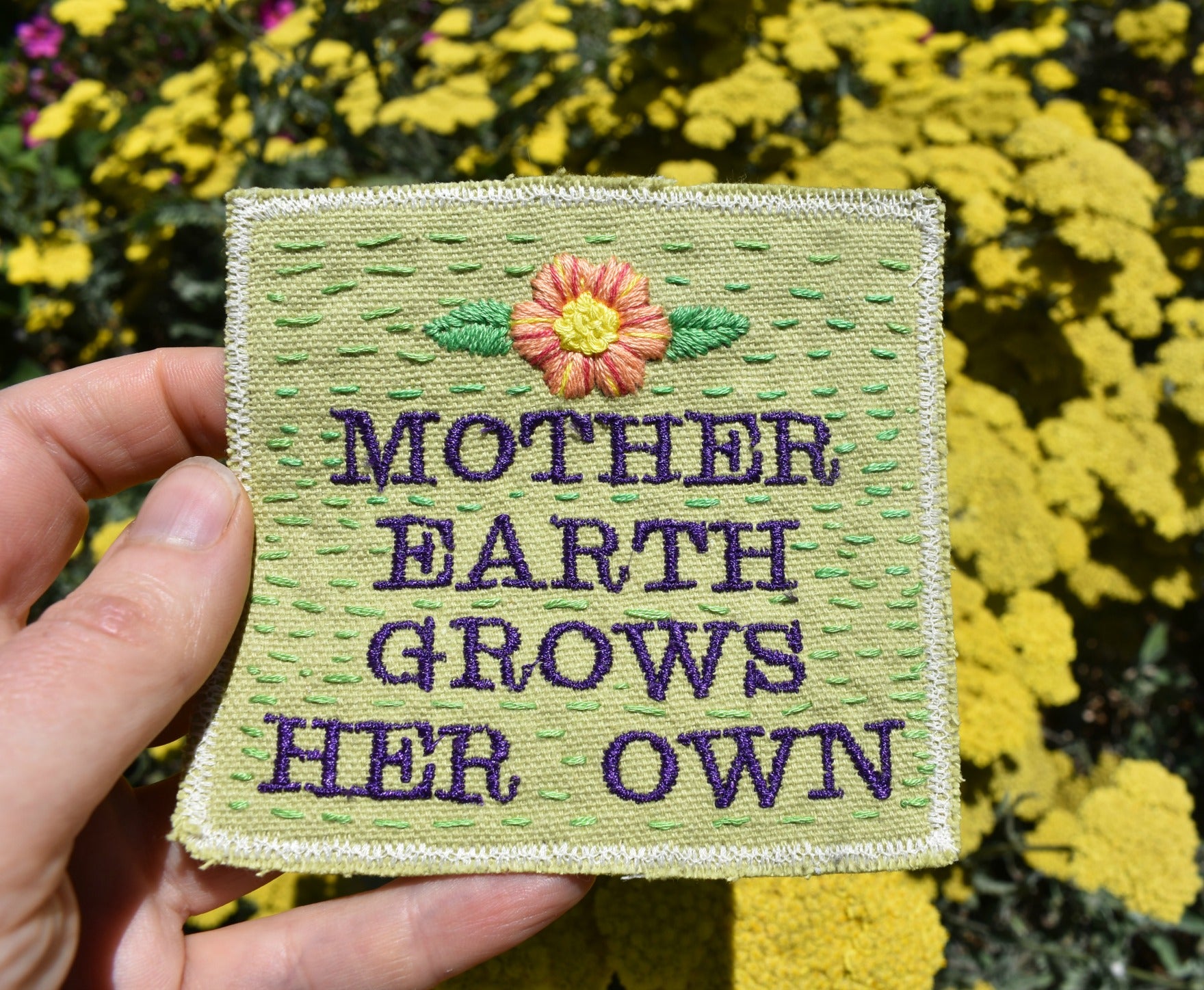 Mother Earth Grows Her Own. Handmade Embroidered Canvas Patch.