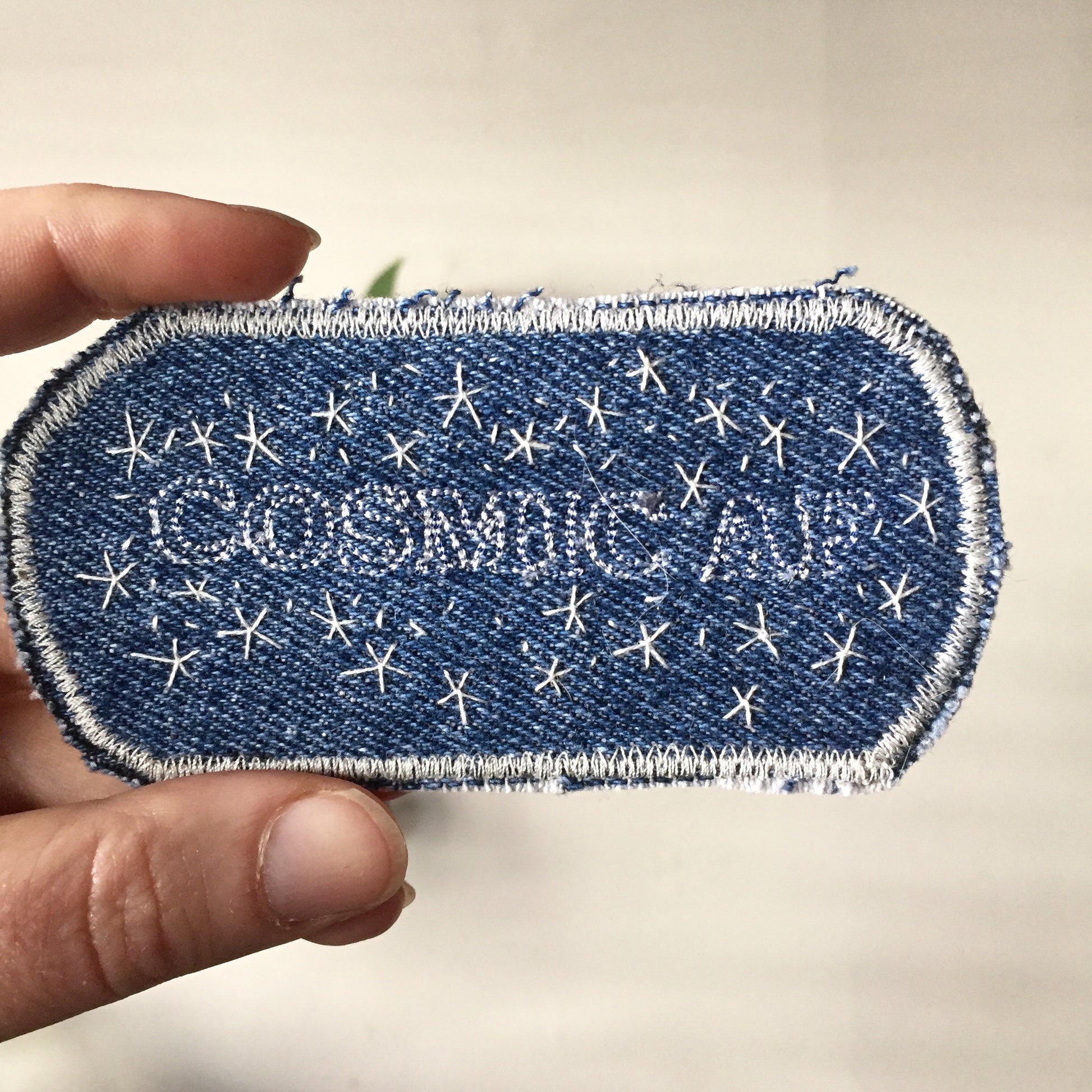 “Cosmic AF” machine embroidered on vintage denim with hand embroidered accents.
