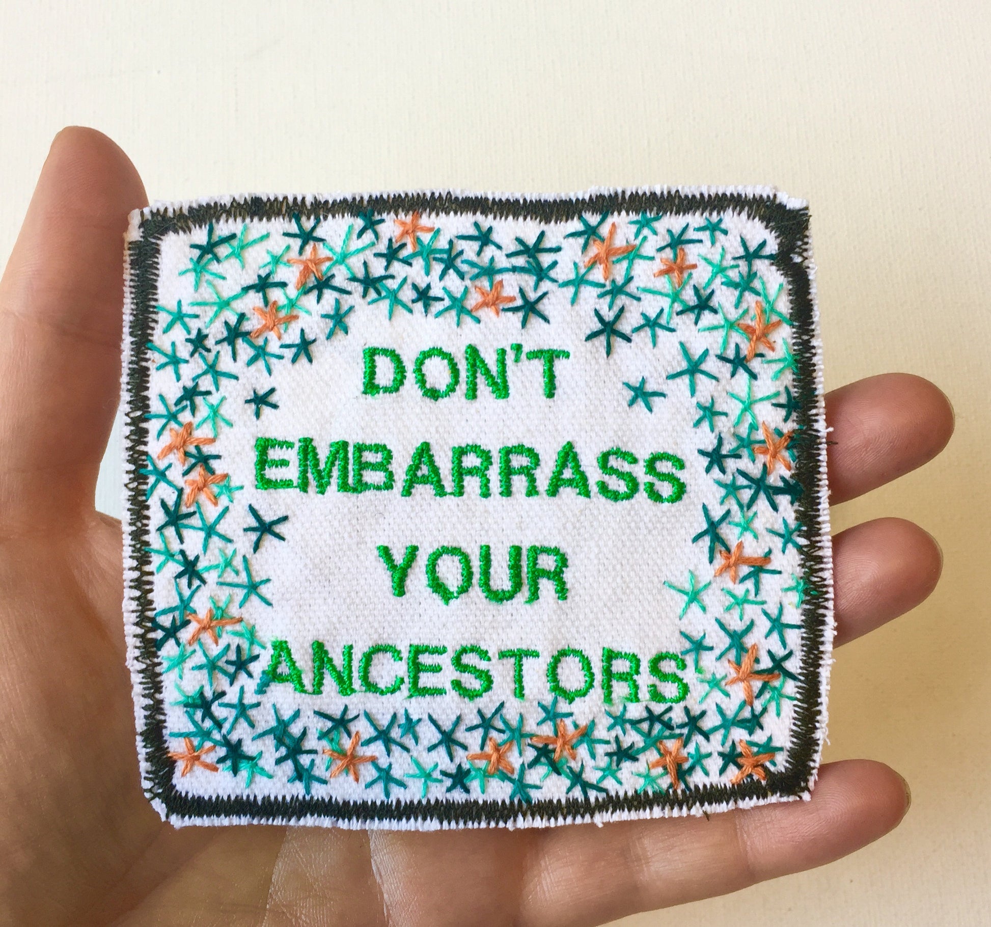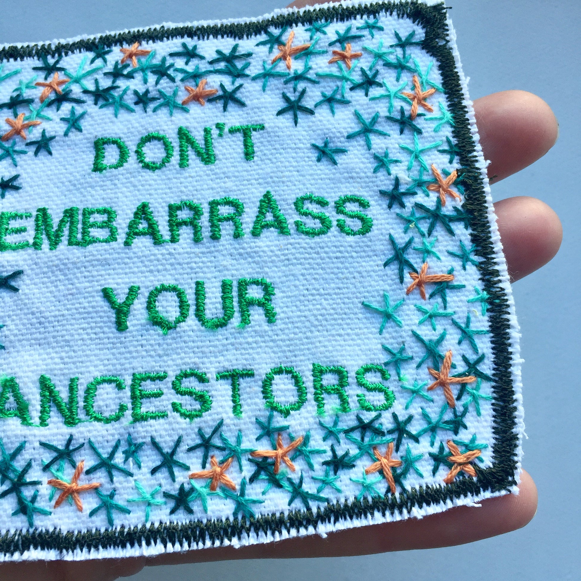 Don't Embarrass Your Ancestors. Handmade Embroidered Canvas Patch.