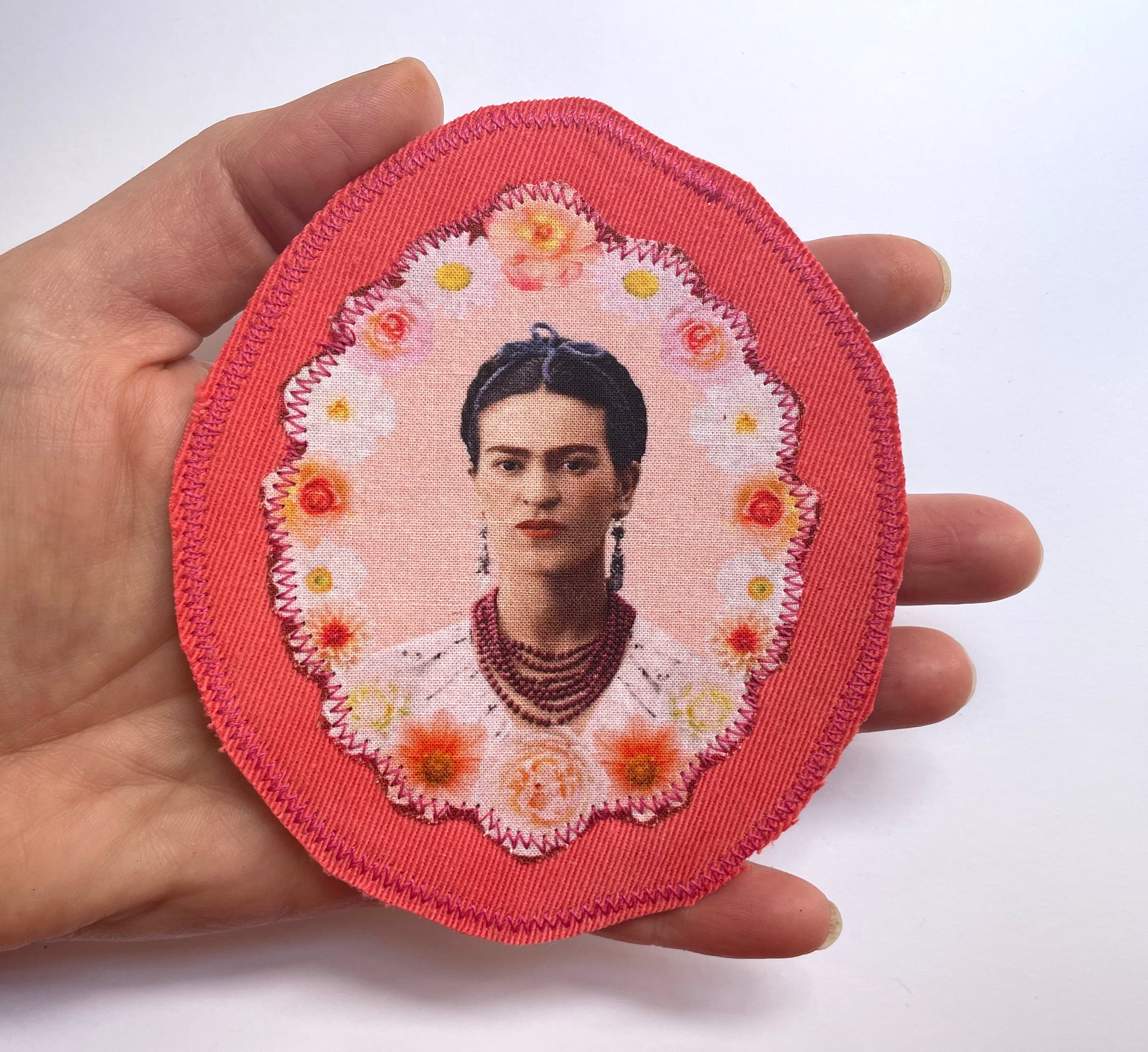 Handmade upcycled patch featuring the inimitable Frida Kahlo, framed by flowers on a canvas backing.