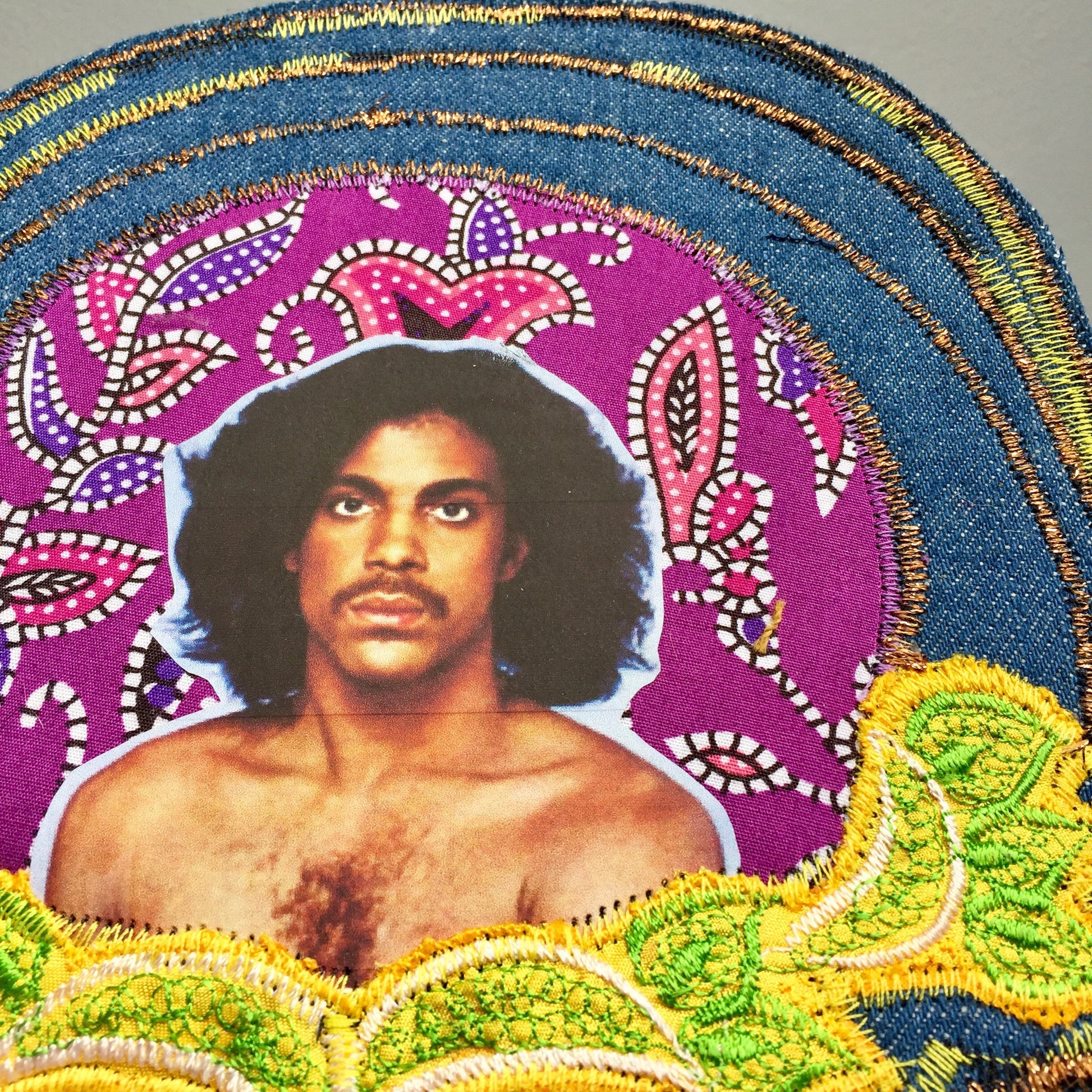 Handmade denim patch with an iconic photo of Prince. Made with a mix of fabrics and embroidery from a vintage Indian blouse. Finished with a fusible fabric on the backside for strength and longevity.
