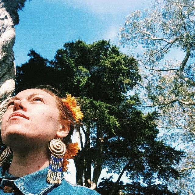 I made these with vintage brass components that I drilled and beaded with vintage glass seed beads. They hang 5.5 inches long from sterling silver ear hooks.