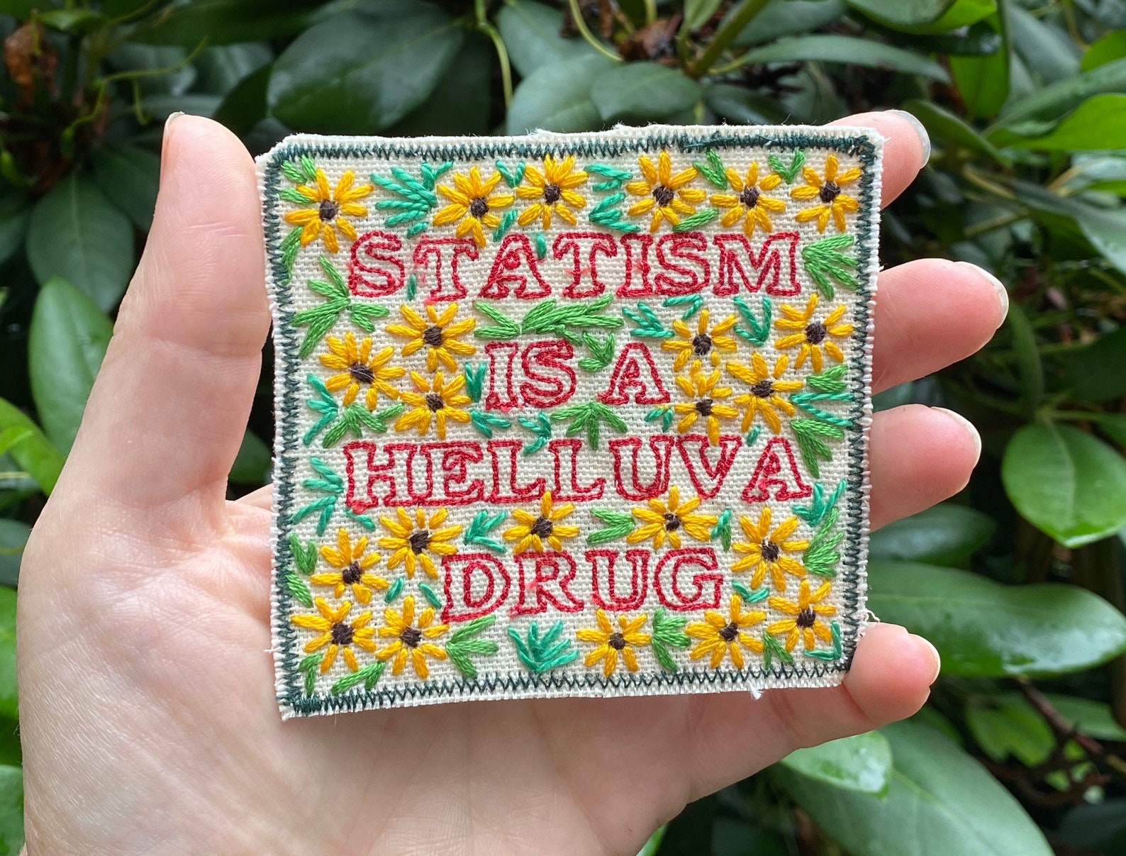 Statism is a Helluva Drug. Hand Embroidered Canvas Patch