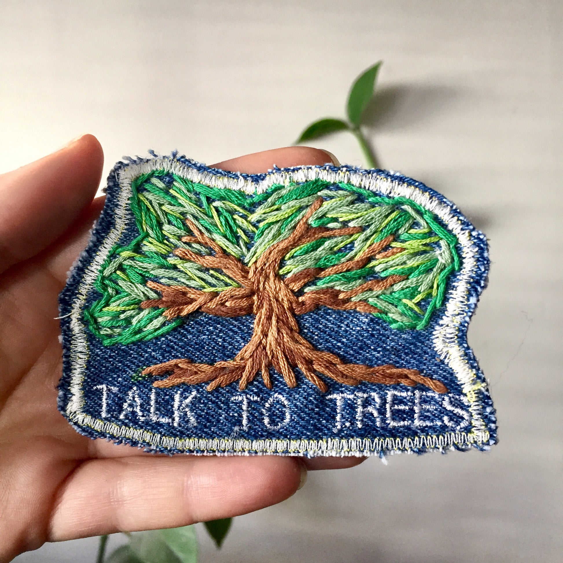 One of a kind patch on denim. Hand embroidered, machine sewn, finished with fusible fabric for durability.